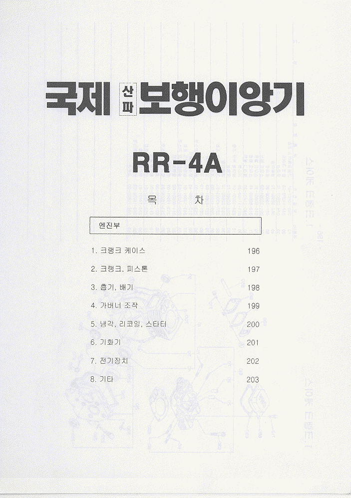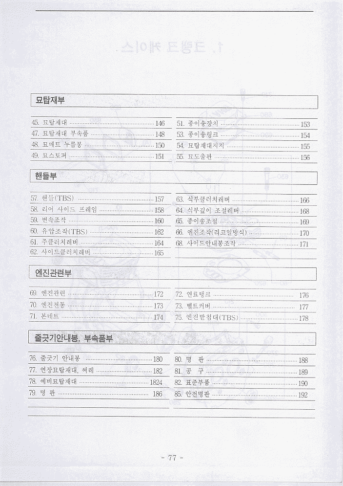 목차 | 사진 | 설명서 | 엔진부78~95/172_173 | 밋션부96~108 | 주행부109~129 | 식부부130~145 | 묘탑재부146~156 | 핸들부157~171 | 카바및기타174~193 | 4A엔진부196~203 | 4B엔진부206~211 |
